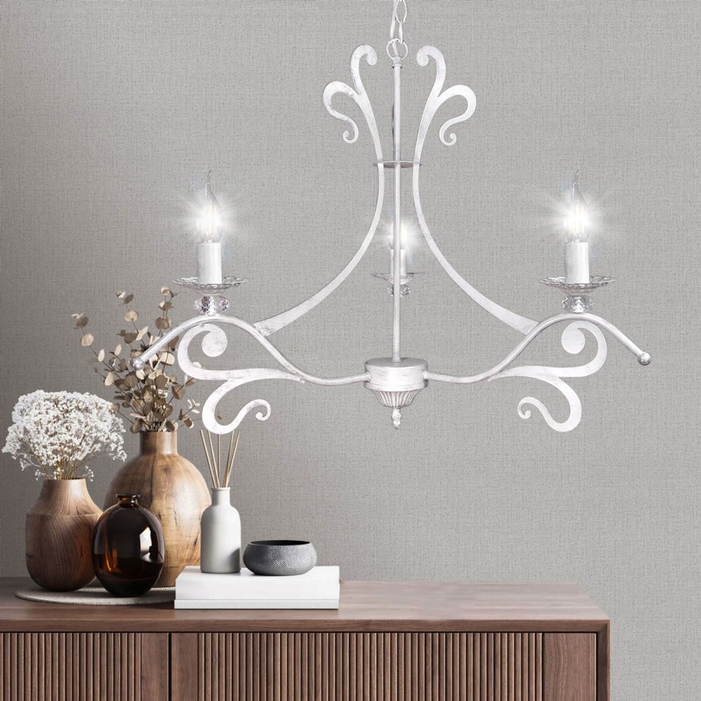 Люстра имеет внушительные размеры: ширина 70 см и высота от 71 до 88 см, что позволяет ей эффективно освещать большую площадь. Благодаря трехрожковой конструкции, свет равномерно распределяется по комнате, создавая мягкое и рассеянное освещение. Стиль неоклассики, воплощенный в дизайне люстры, подчеркивает ее элегантность и утонченность. Хрустальные вставки, расположенные на рожках, не только добавляют визуальный интерес, но и преломляют свет, создавая игру бликов и теней, что придает интерьеру особую атмосферу. Белый цвет с патиной серебра придает светильнику благородный и сдержанный вид, который гармонично впишется в любой интерьер. Ширина основания 12 см обеспечивает устойчивость и стабильность конструкции.