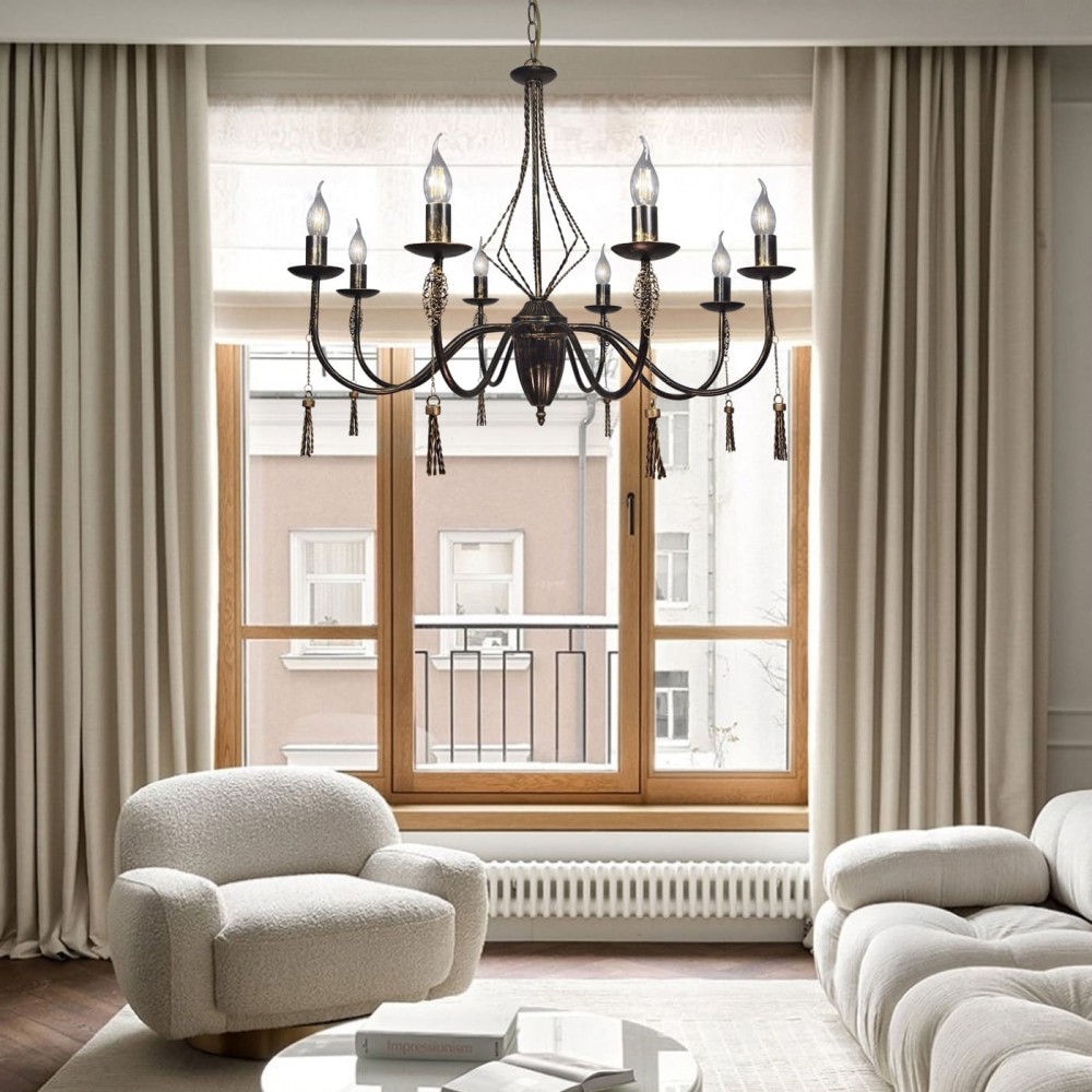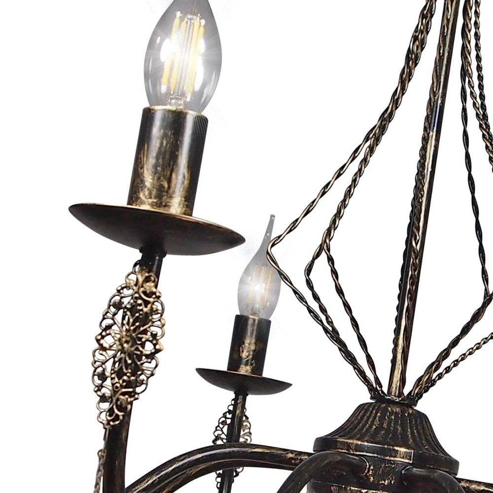 - Роскошный Дизайн: Люстра выполнена в классическом стиле с элементами неоклассики и прованса. Черный металл с патиной золота создает ощущение богатства и изысканности, а продуманная конструкция плафона обеспечивает красивое рассеивание света, не создавая бликов и ослепления.