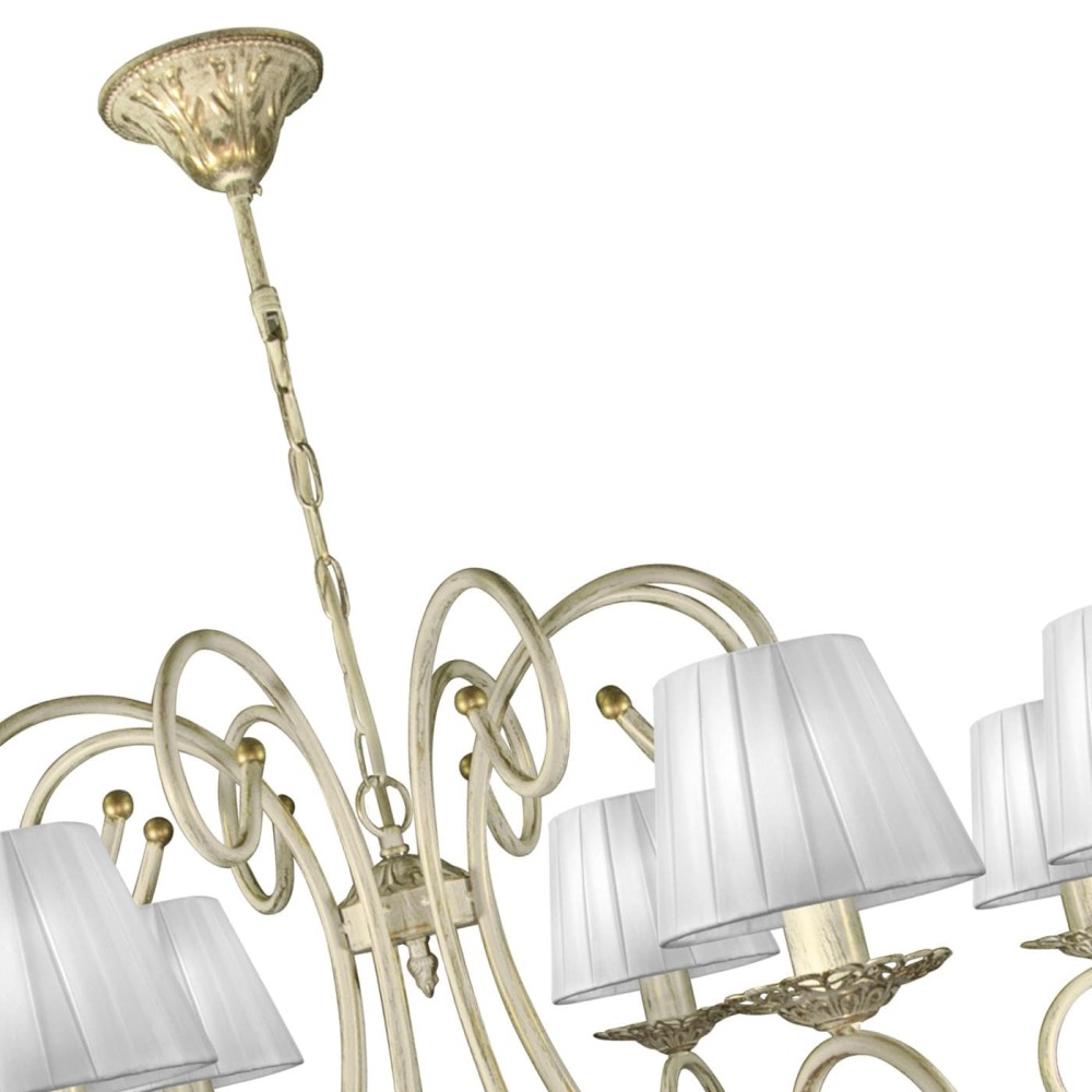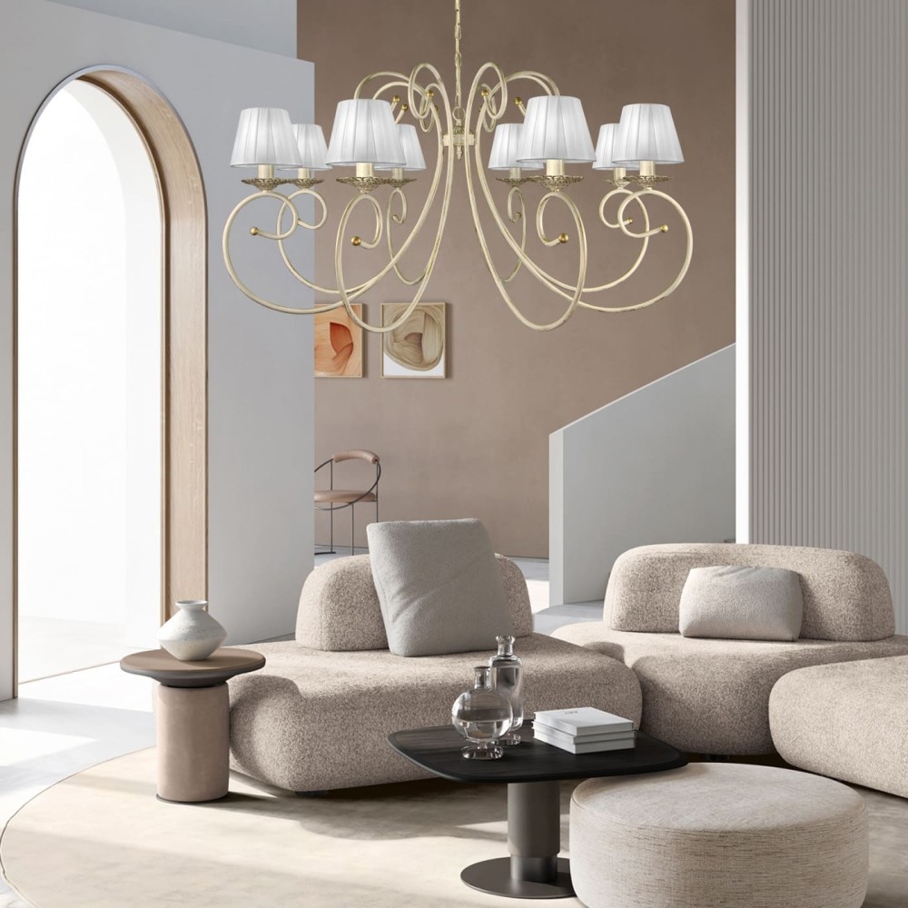 Эта люстра – настоящая жемчужина в мире освещения. Ее классический дизайн, выполненный в неоклассическом стиле, сочетает в себе элементы роскоши и изысканности. Абажуры из ткани придают светильнику мягкий, рассеянный свет, создавая атмосферу уюта и тепла. Патинированное покрытие металла придает светильнику винтажный вид и добавляет ему шарма. Благодаря своему элегантному дизайну, люстра станет прекрасным дополнением к любому интерьеру.