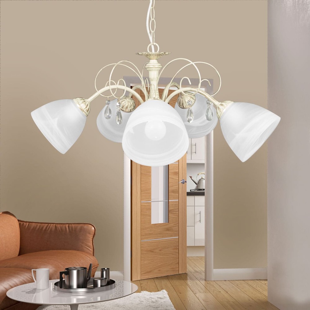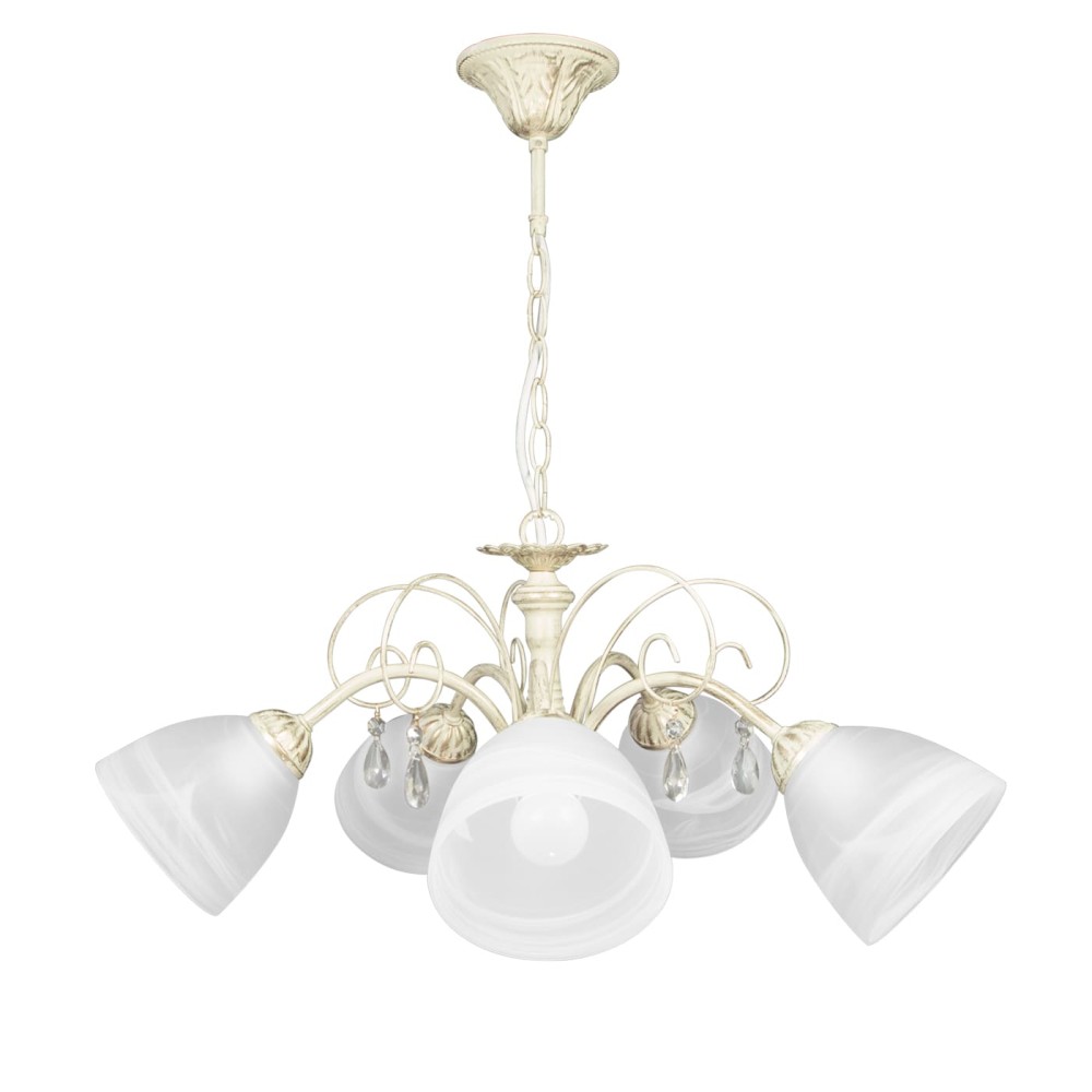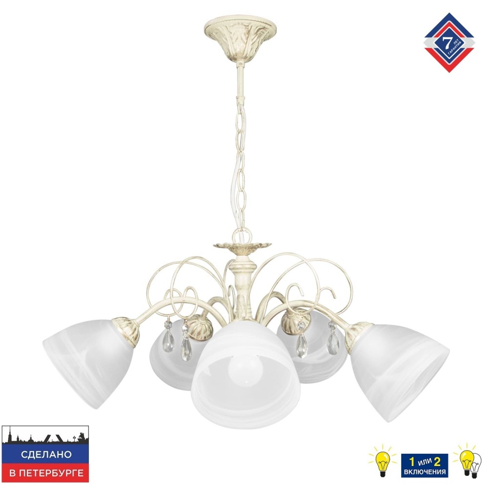 Люстра подвесная 5 плафонов дизайнерская Петрасвет производство люстр №1 в России S8042-5, 5хЕ27 макс, 60Вт с плафонами из стекла и хрустальными подвесками, цепь можно укоротить до 1 звена на 17 см, стиль - классический, арматура - металл, цвет светильника- белый с патиной золота, размеры светильника (LxWxH) - 62x62x72, вес - 3 кг, Люстра на 2 включения, Люстра подвесная и для натяжных потолков и освещение 15-20 м2 помещения в зависимости от мощности лампочек Е27, Люстра подвесная цепная 5 рожковая подходит для освещения комнат, кабинета, гостиной, спальни, столовой, детской, кухни, Заводсткая гарантия завода Петрасвет 7 лет, Люстры пяти рожковые собраны и проверены на производстве, люстры просто собираются, плотно упакован в коробке из тройного гофра картона, Упаковка выдерживает и гарантирует сохранность содержимого при падении на дно и ребро коробки с высоты 110 см, Лампочки светодиодные LED подбираются по следующим параметрам: для яркого освещения - 3 Вт на 1 м2 комнаты, для среднего - 2 Вт на 1 м2, В случае боя или не комплекта, вышлем новый за свой счет в день обращения,