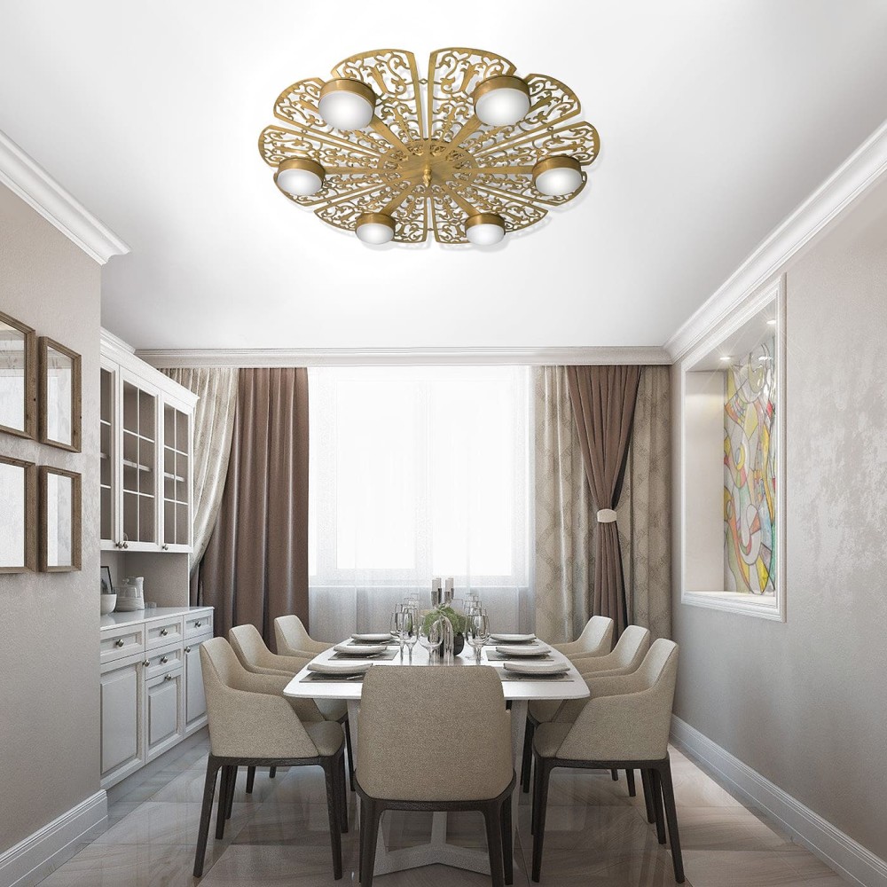 - Современный дизайн: Люстра выполнена в плоской круглой форме, что придает ей элегантный и минималистичный вид. Сочетание золота с патиной золота и металлического каркаса создает ощущение роскоши и благородства. Дизайн, ориентированный на современные тенденции, идеально впишется в любой интерьер, от минимализма до неоклассики. Ее округлая форма рассеивает свет равномерно, создавая мягкое и приятное освещение.