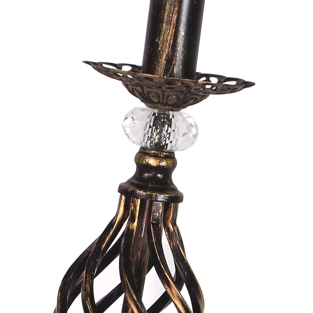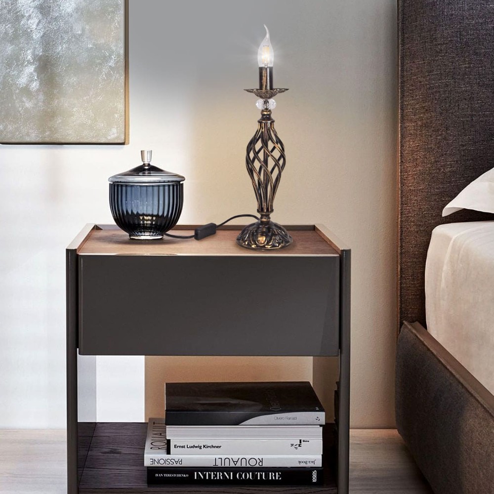 Корпус лампы выполнен из прочного металла, обеспечивающего долговечность и устойчивость к повреждениям. Черный цвет с патиной золота создает контраст, подчеркивая красоту хрустальных вставок и добавляя лампе изысканность. Эта комбинация цветов и материалов делает лампа не только функциональной, но и стильным акцентом в интерьере.