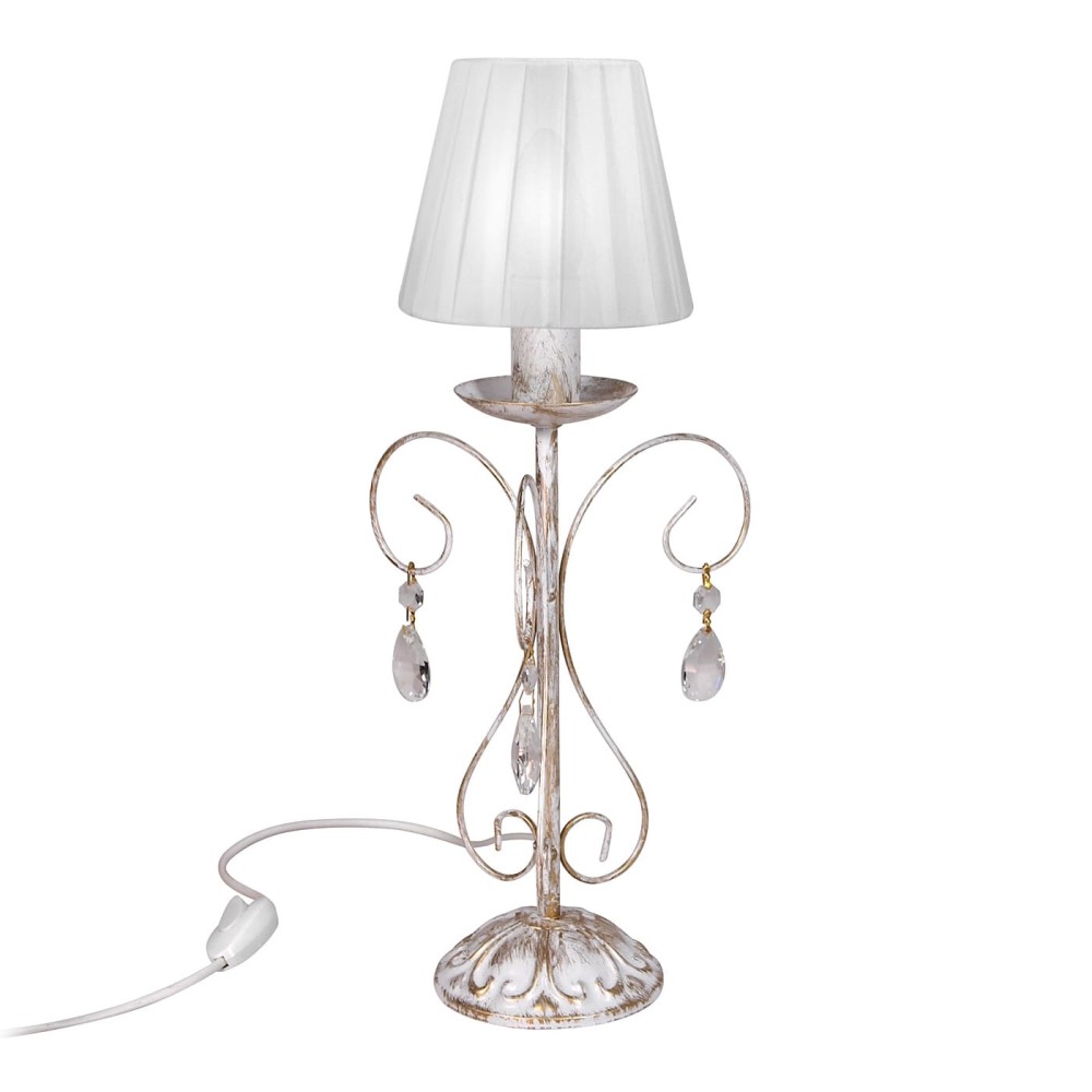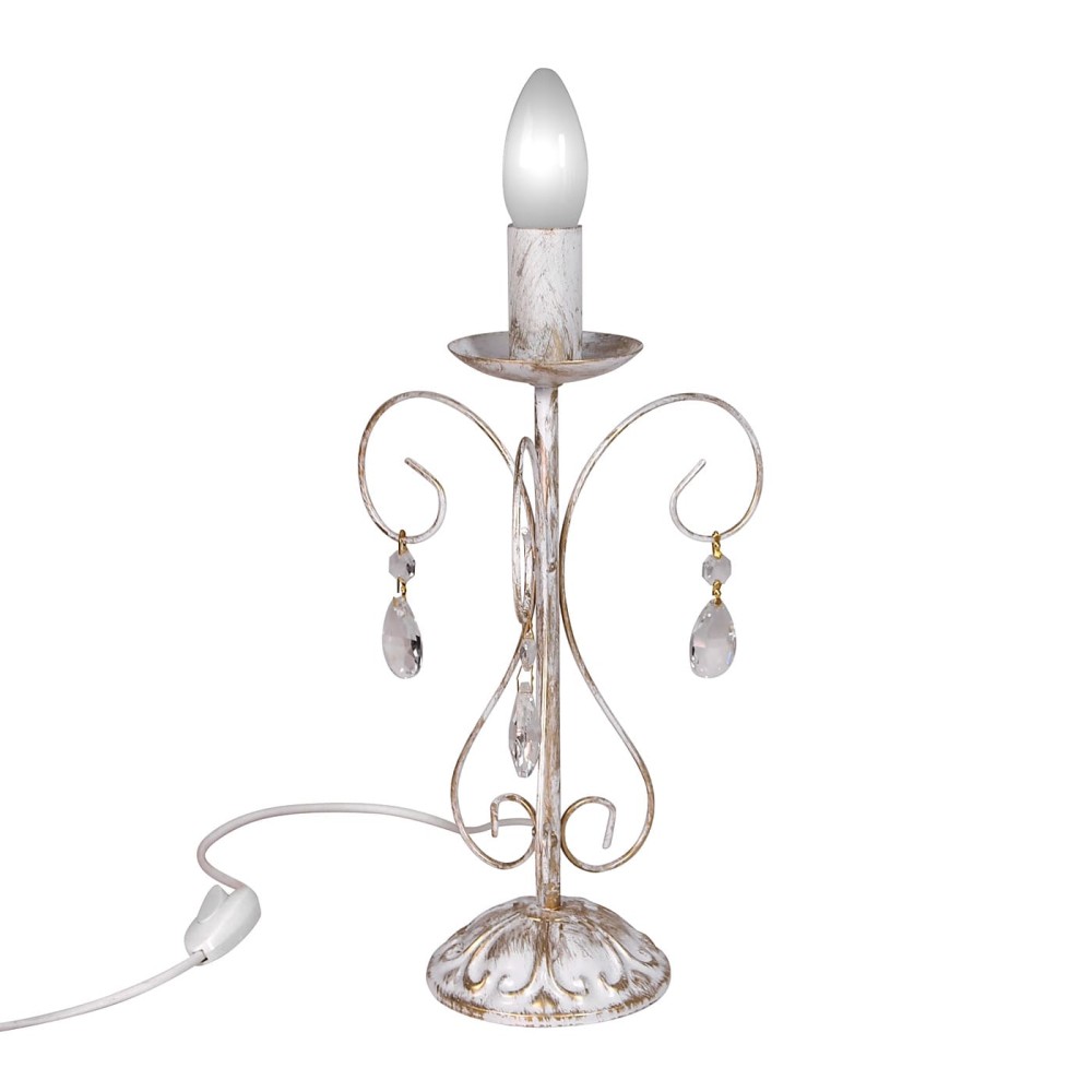 Настольная лампа с хрусталем белая российского производства ПЕТРАСВЕТ S5100-1, 1хЕ14 макс, 60Вт с хрустальными подвесками, стиль - классический, арматура - металл, цвет светильника- белый с патиной золота, размеры светильника (LxWxH) - 14x14x27, вес - 0,5 кг, Настольный светильник рассчитан на освещение 3-6 м2 помещения в зависимости от мощности лампочек Е14,