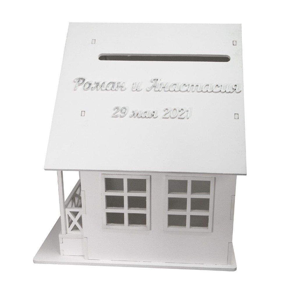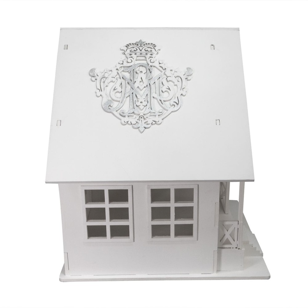 Свадебный дом для денег дизайнерская Петрасвет производство люстр №1 в России S4029 вырезан лазером из фанеры, цвет белый с декором серебра, Домик очень прочный, и в дальнейшем может послужить долгие годы игрушкой для ваших детей, Белая краска в три слоя идеально пропитывает березовую фанеру, подчеркивая и выделяя ее причудливые рельефные узоры, Серебром выделены надписи и семейный герб на нем, Каждый элемент домика тщательно прокрашиваем вручную,